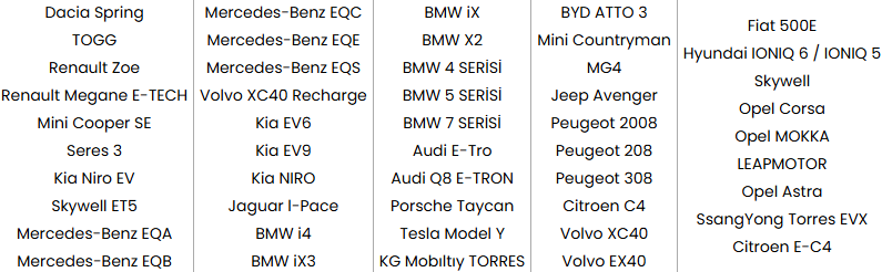 Tüm elektrikli araçlar ile uyumlu şekilde kullanımı sağlanabilmektedir. Elektrikli araç şarj cihazı ile dilediğiniz arabanın şarj işlemlerini kolayca halledebilirsiniz. Örnek olarak bu marka arabalar ile kullanımını sağlayabilirsiniz;
