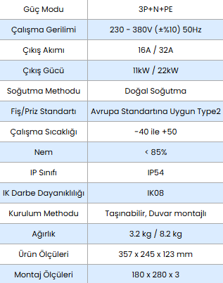 22kW gücünde çalışır. 380V (trifaze) 32A beslemeye sahiptir.